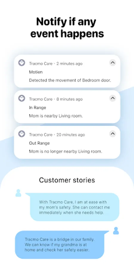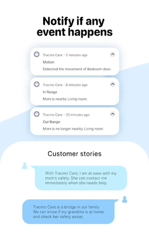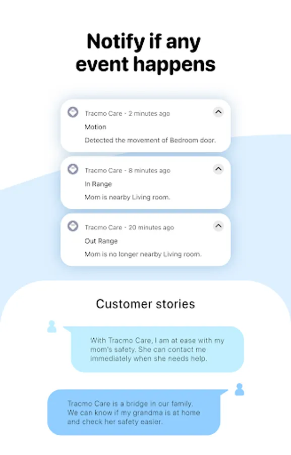 Tracmo Care App can help you monitor the activities of your beloved family members when you’re not with them and notify you when there’s an emergency situation.