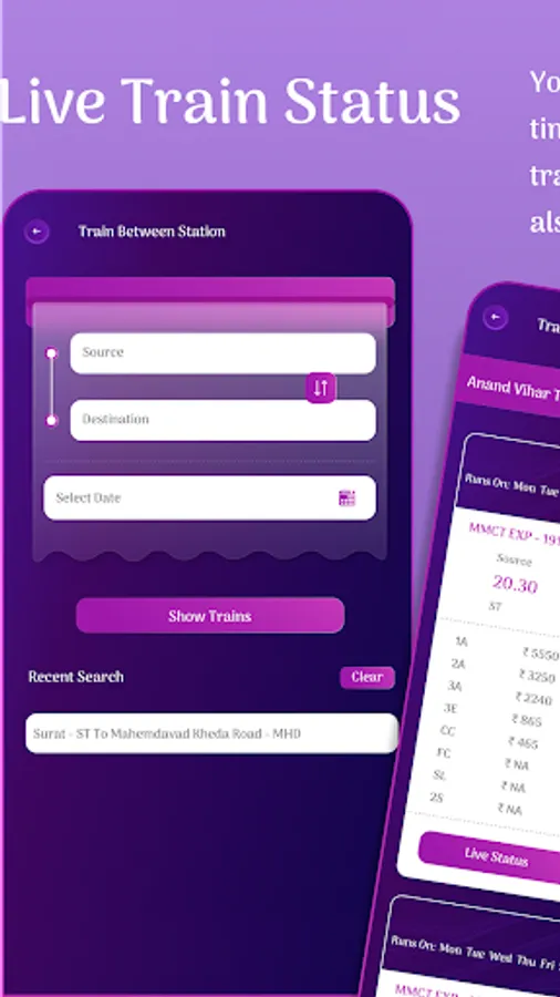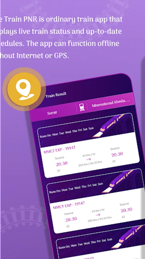 The train app has the Indian Railways timetable offline. You don't have to know train number or names as our Smart search feature allows you to use train source & destination.