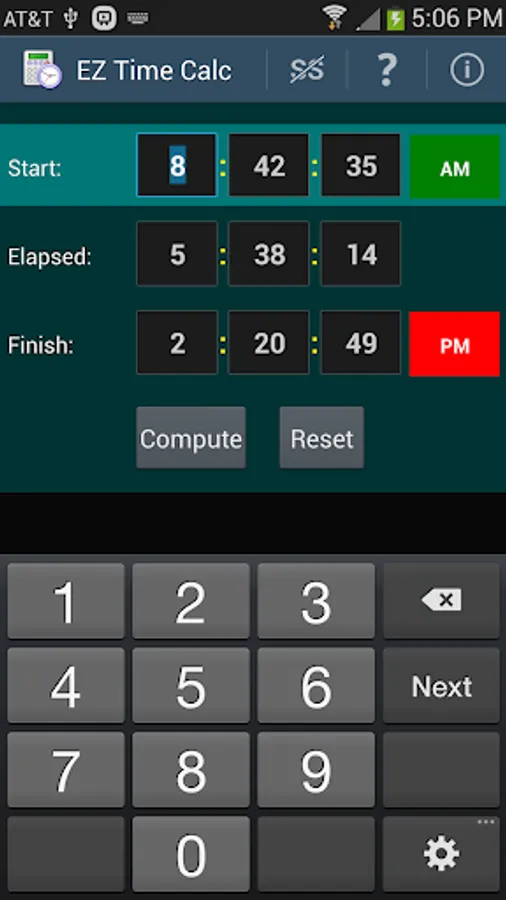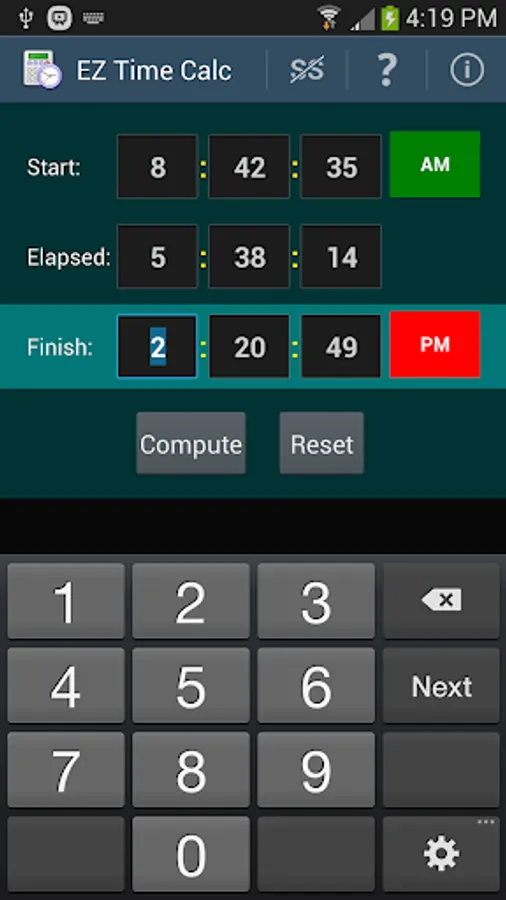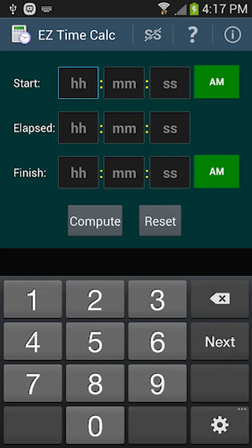 A simple tap on one of the time field labels (Start, Elapsed, or Finish) clears the contents of the associated row of values, making it easy to change a value and recompute quickly. A menu option allows you to show or hide the seconds field to match your personal computing needs (just hours and minutes, or hours, minutes, and seconds).