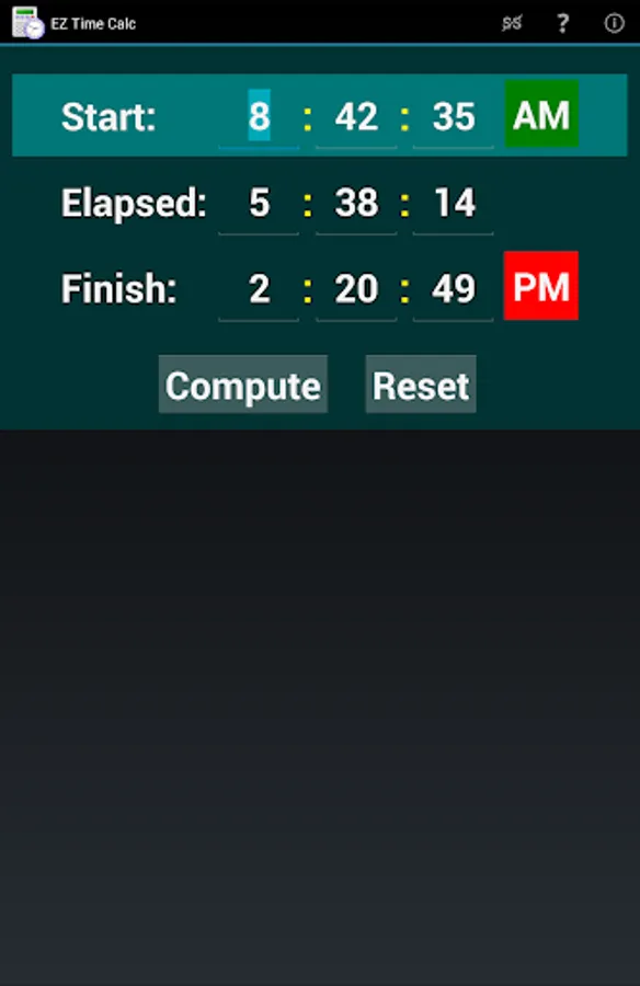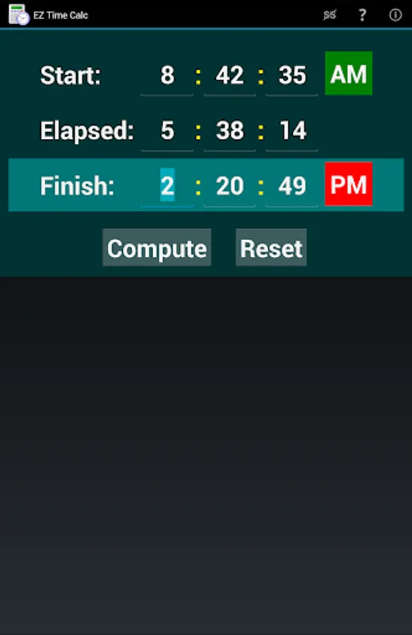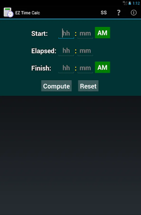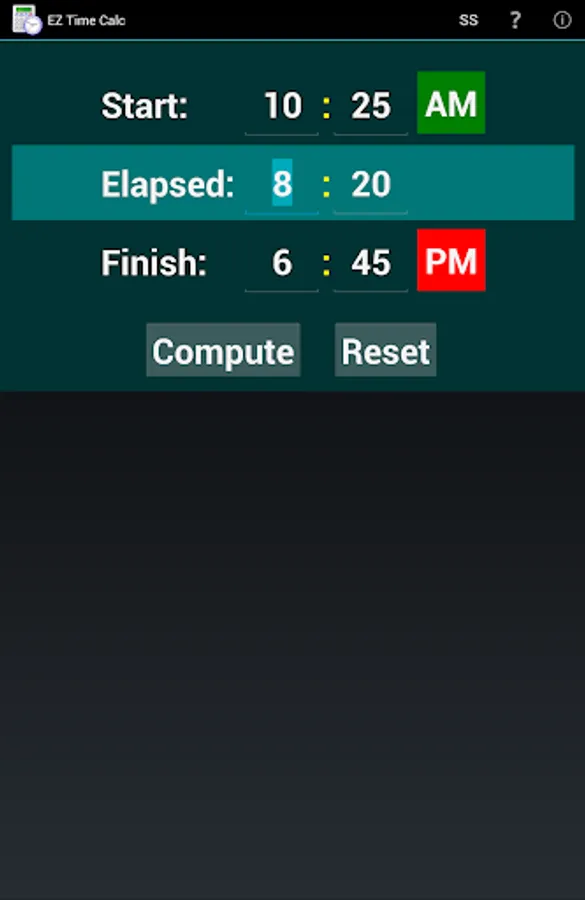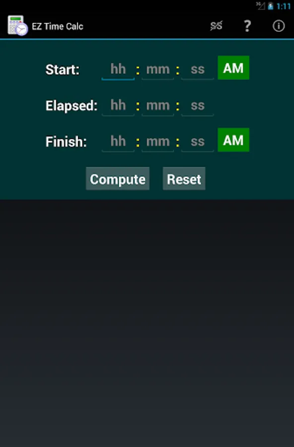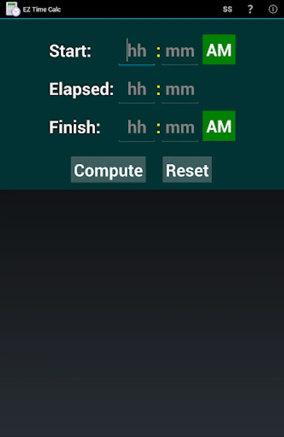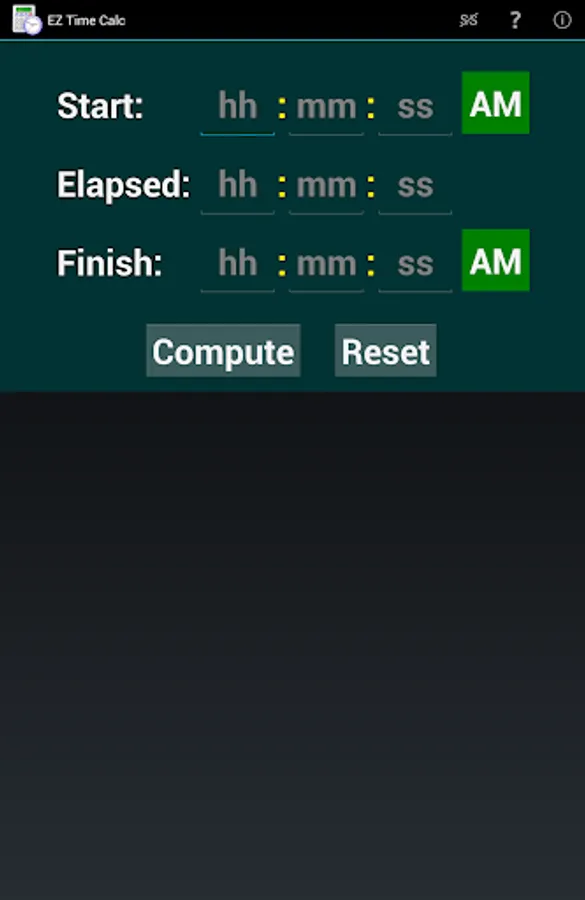 Please note that this app is not designed to compute a split time between two stopwatch times. It expects a valid number of hours (1-12) in the start and/or finish time fields, and does not include a field for fractional seconds like you would find on a stopwatch. It's purpose is to help people with actual clock time using AM/PM notation.