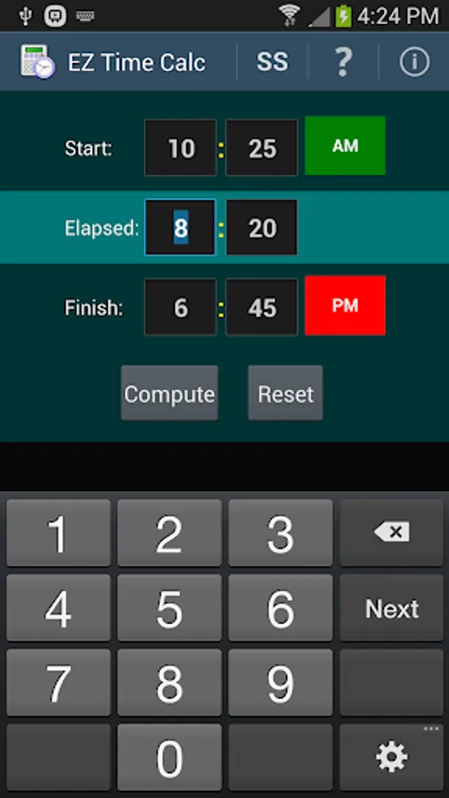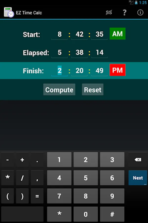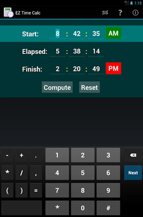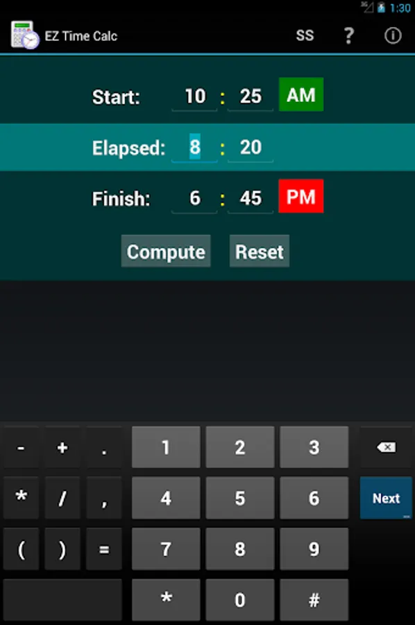 Need to know how long you worked, or what time to start dinner? This app can compute the answer in no time at all! Auto-tabbing between fields, intelligent validations, and the ability to quickly re-compute after changing values makes the operation clean, fast, and simple.