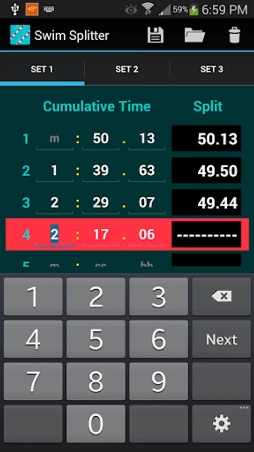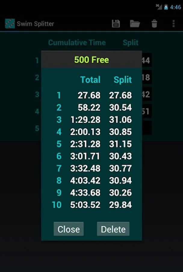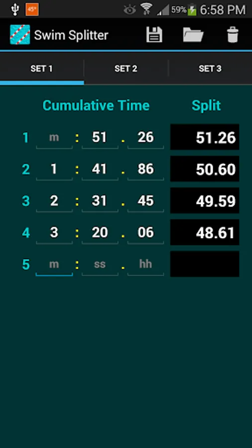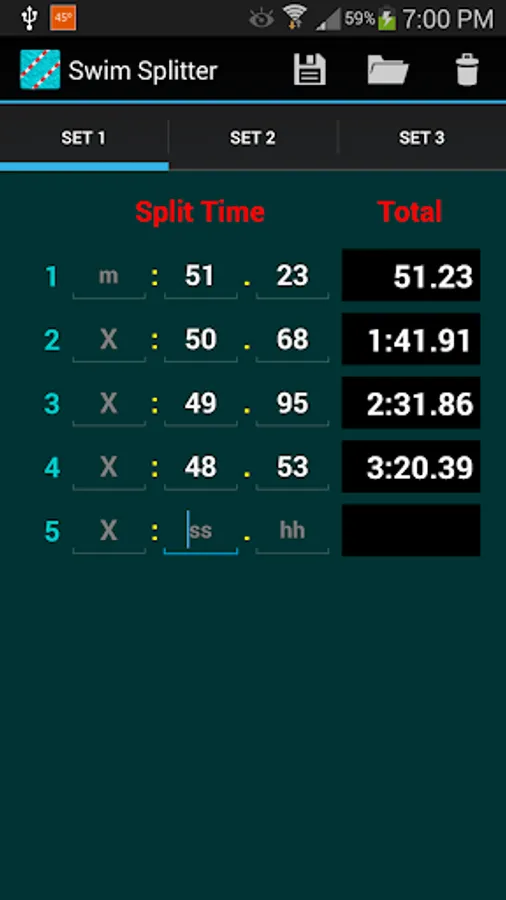 Get instant, official split times for up to 3 lanes simultaneosly! Swim Splitter computes individual or subtracted splits from cumulative scoreboard times. Pool scoreboards often display the total elapsed time when a swimmer hits their touchpad, but a swim parent or coach typically wants to know the time for each lap or leg (in the case of a relay). What was my child's split in that freestyle or medley relay? How are they progressing in their 500 Free or 400 IM? Why use a stopwatch app when you can get the official split in an instant? Get the swim split calculator that eliminates the guesswork and get the official split times. Record splits for up to 3 lanes at once!