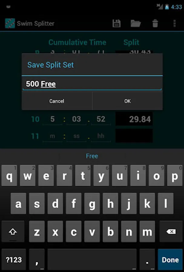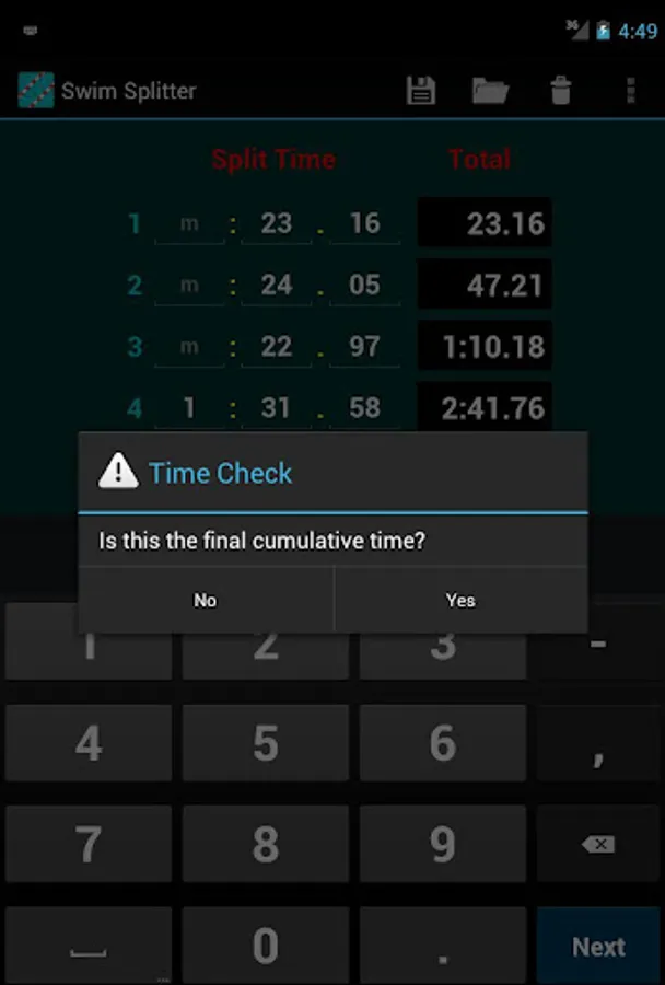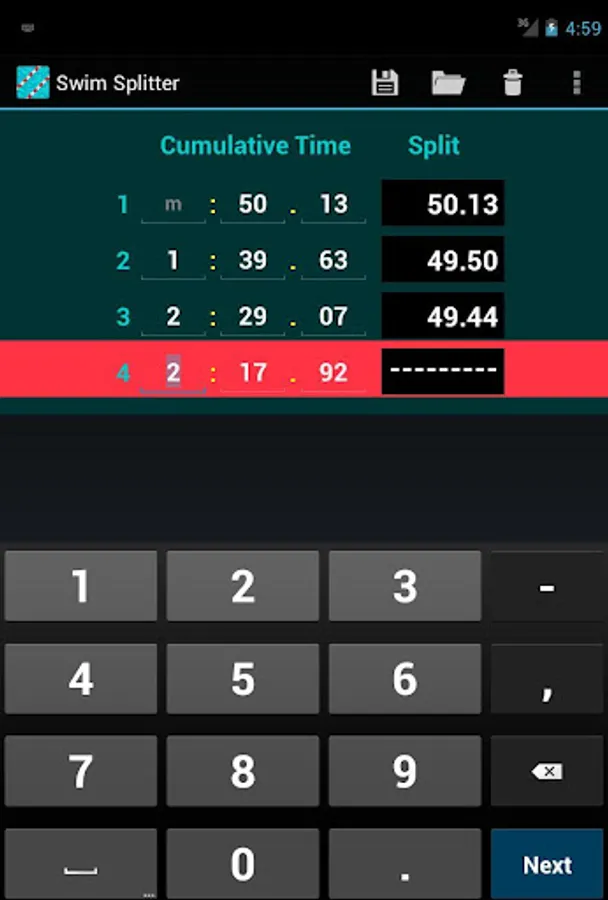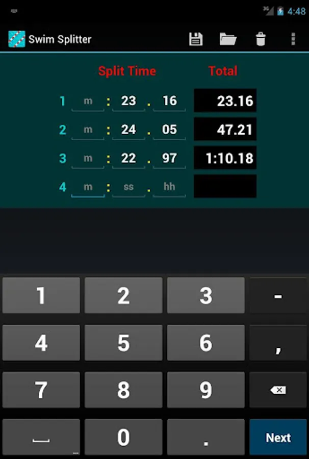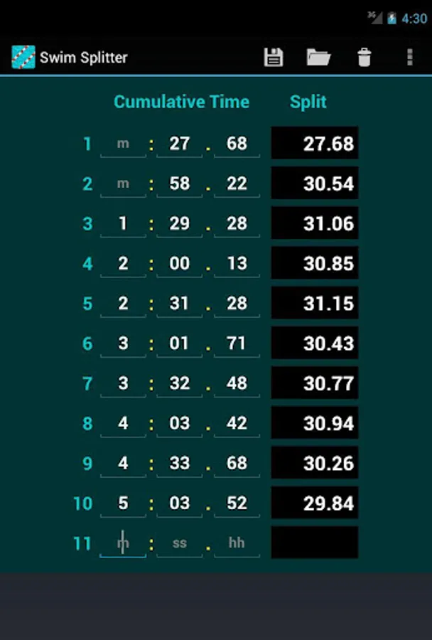Enter as many times as necessary for the event without specifying the number of laps beforehand. The app simply computes the split and adds a new time entry line when the last one has been populated. Automatic tabbing between time-entry fields makes time entry extremely fast and easy. Times are validated as they're entered, and splits are automatically recomputed when a correction is made to a previously entered time.
