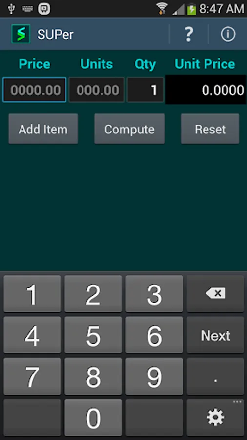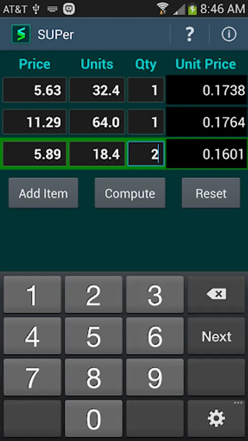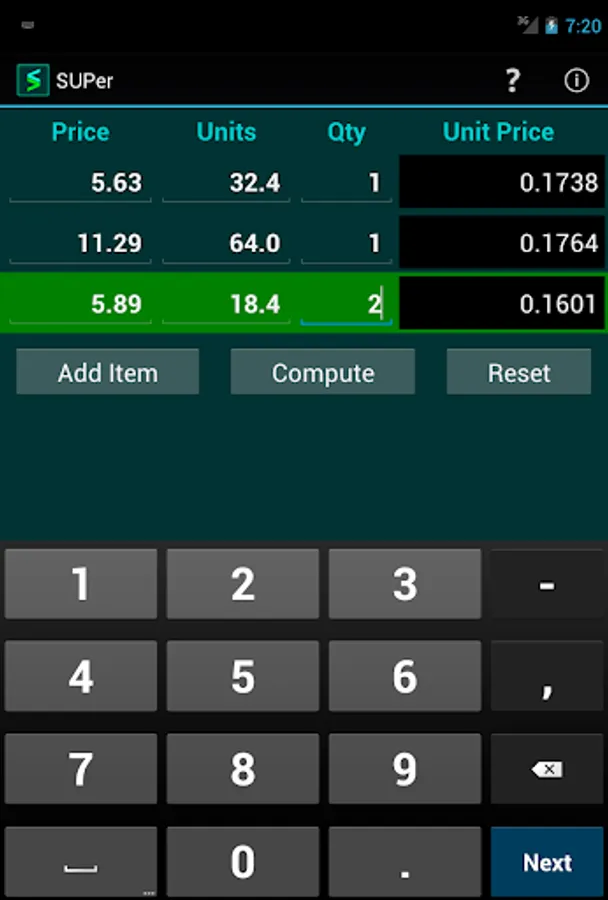 Enter as many items as you'd like via the "Add Item" button. When you tap "Compute" the app will display each unit price and highlight the lowest row (or rows, in the case of a tie). It doesn't get any faster or easier than this. Give it a try, it's free!