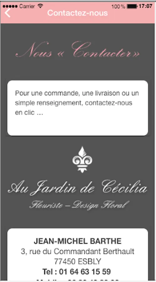 Our Application "Au Jardin de Cecilia" offers the opportunity to consult all the relevant information about our store (Our Services, Our compositions, Our bouquets and our Special Offers ...)