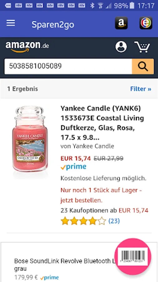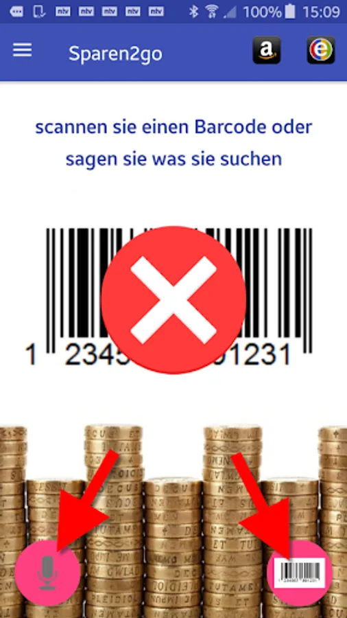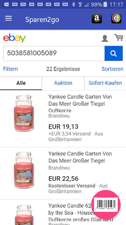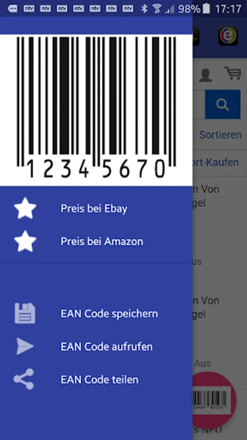 Simply scan the barcode of the item for free with the phone or tablet and get the best prices for your product from the largest online portals Ebay and Amazon.