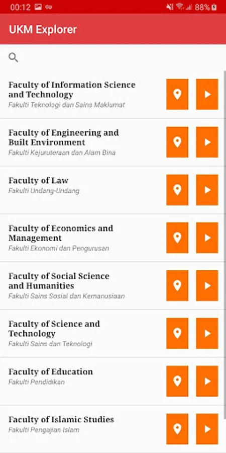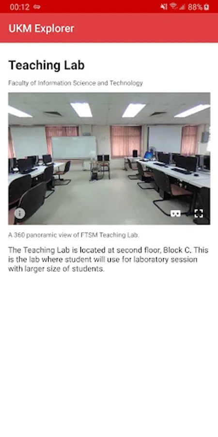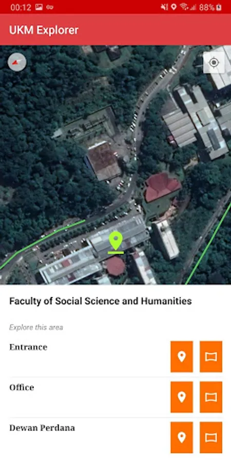 UKM Explorer is an application for UKM students to explore the places within the UKM main campus. It comprises of faculties, residential colleges, halls, centres, research institutes, amenities, administration and services and sports. It presents the location in a map view for easier navigation and it provides 360° panoramic view for some places to provide an overview about the place.