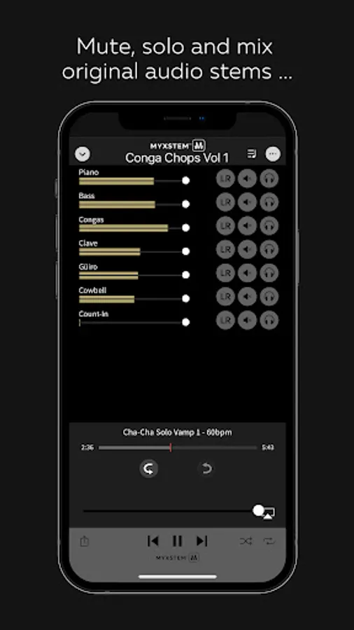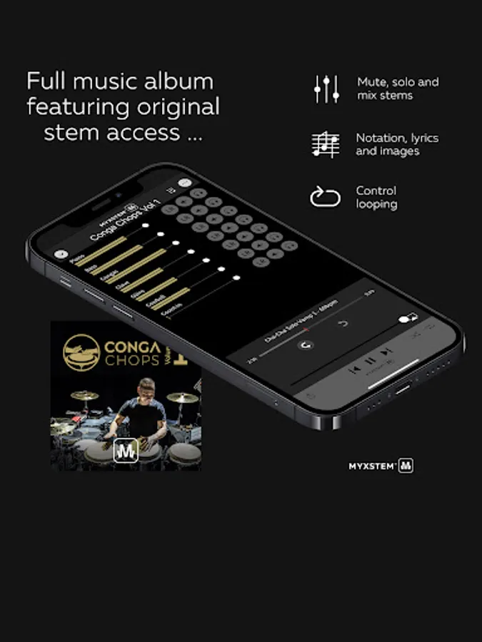 ‘Conga Chops - Volume 1’ is a MYXSTEM app release, allowing users to completely control the listening experience. The app features mute, solo, pan and fade for each stem along with looping and lyrics. By adjusting the levels of each instrument (stem), musicians can build the perfect mix to play- and sing-along. All album-as-an-app releases from MYXSTEM deliver interactive audio to create an immersive musical experience.