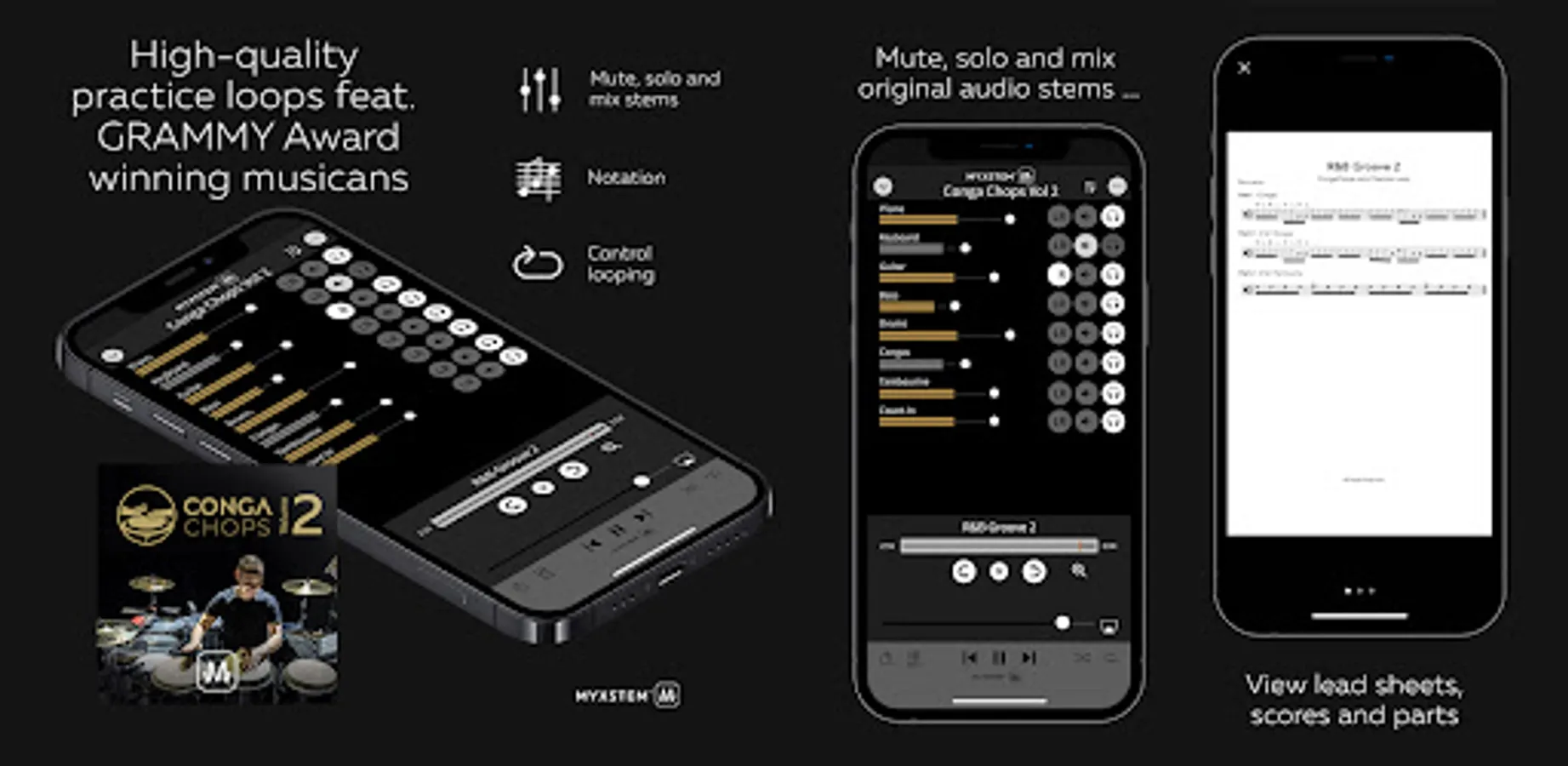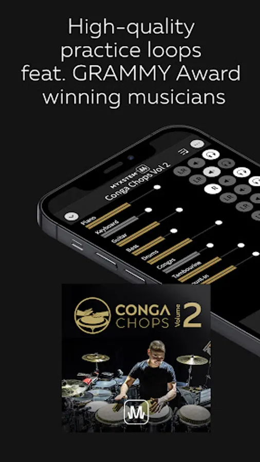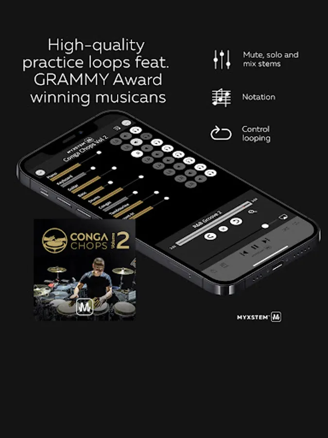 ‘Conga Chops - Volume 2’ is a MYXSTEM app release, allowing users to completely control the listening experience. The app features mute, solo, pan and fade for each stem along with looping and sheet music. By adjusting the levels of each instrument (stem), musicians can build the perfect mix to play- and sing-along. All album-as-an-app releases from MYXSTEM deliver interactive audio to create an immersive musical experience.