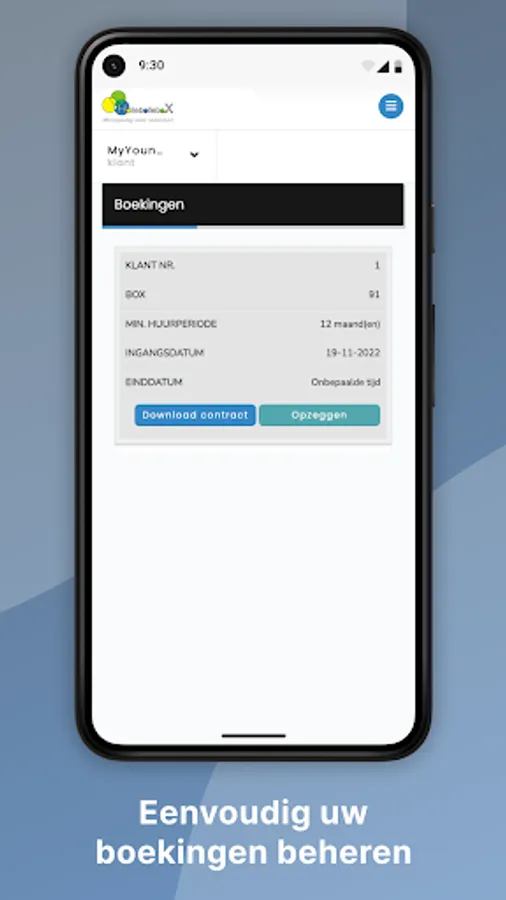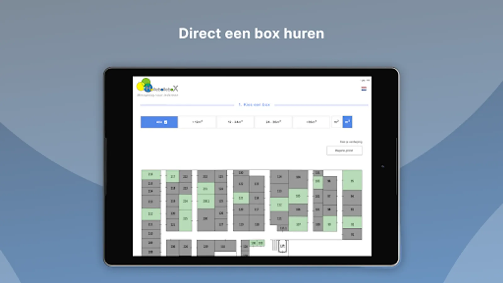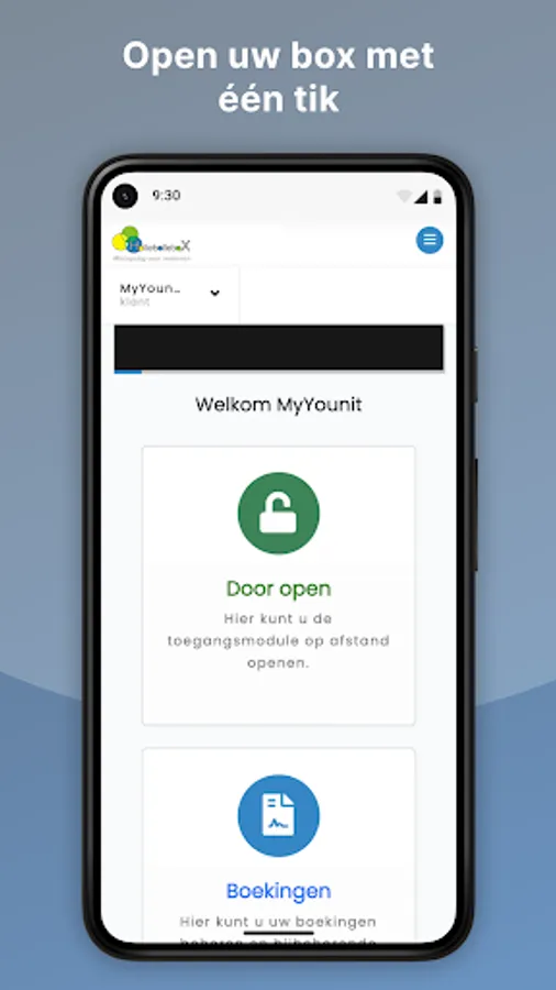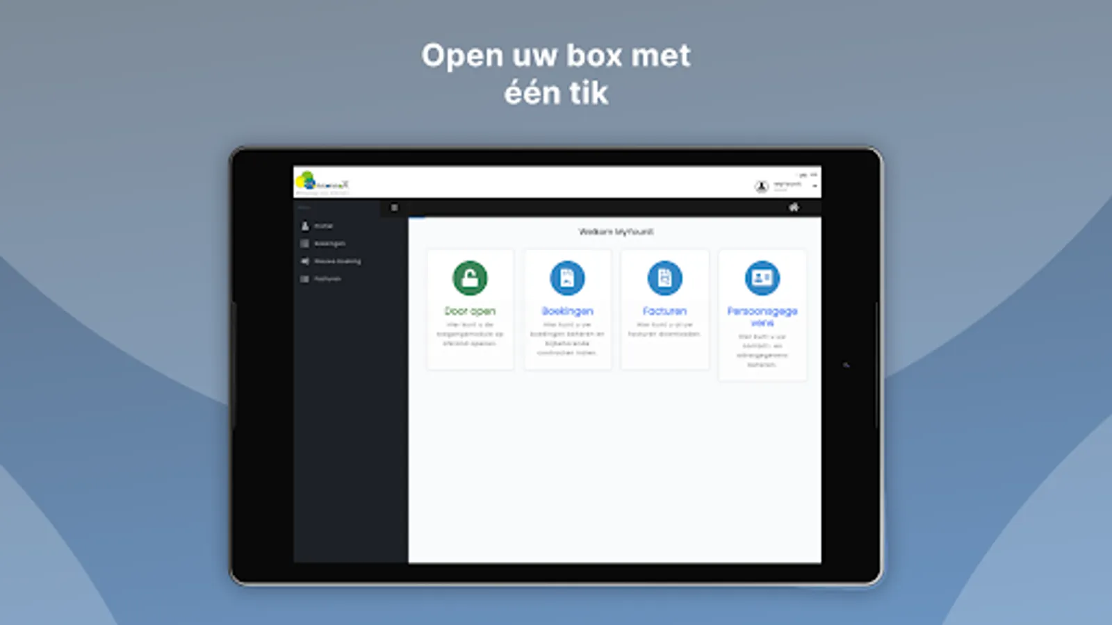 The HollebolleboX App is a personal app for HollebolleboX customers. When you rent a unit at HollebolleboX, you can manage your bookings via the app, view and download invoices, and also open the access module with 1 push of a button.