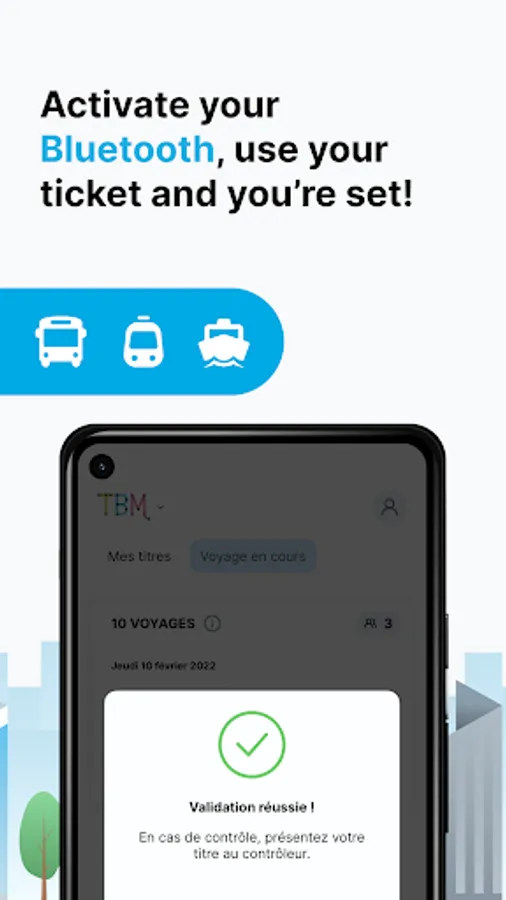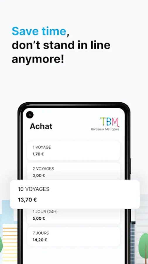 The app eases your public transportation ticket purchase in Bordeaux (TBM), Le Havre (LiA), Brive (Libéo) and l’Ile aux Moines (Izenah Croisières):