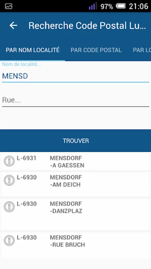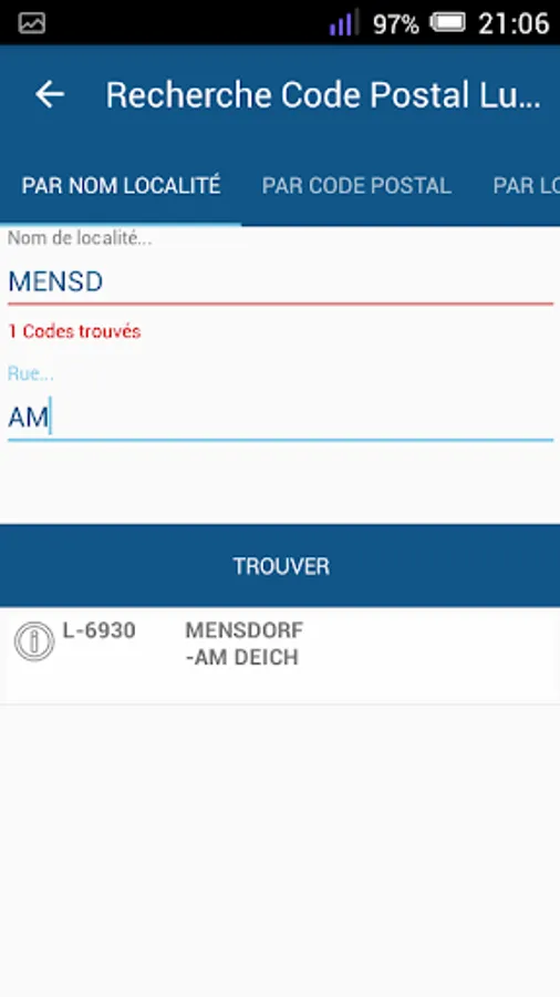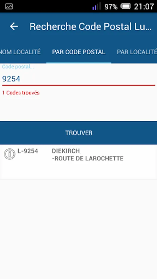 Find a postcode of any place in Luxembourg by giving the location and road,