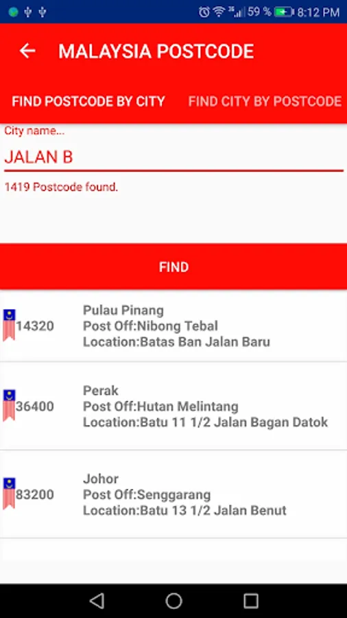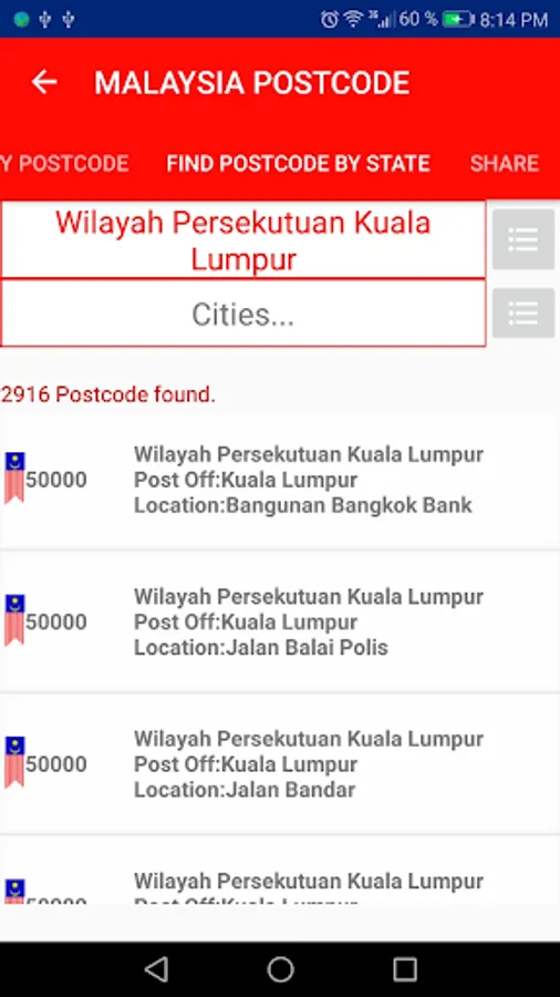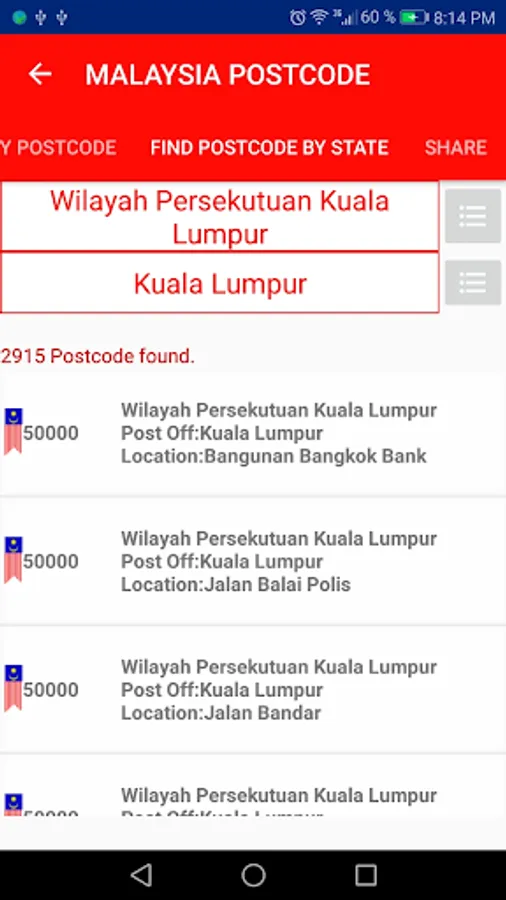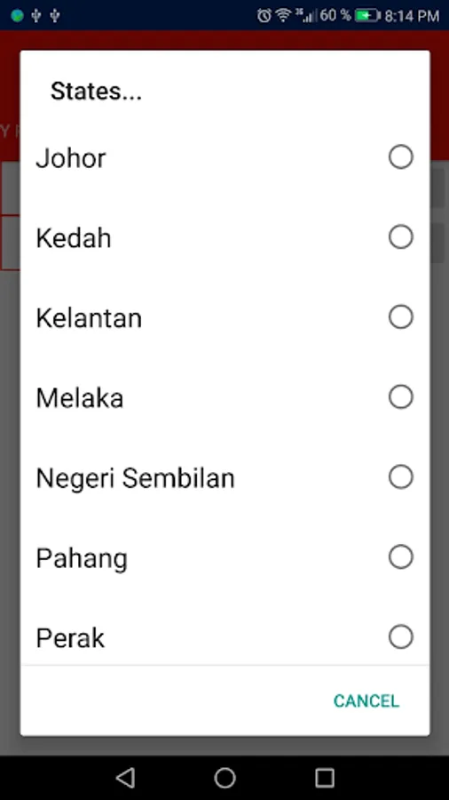 Johor ,Kedah ,Kelantan ,Wilayah Persekutuan Kuala Lumpur,Wilayah Persekutuan Labuan ,Melaka ,Negeri Sembilan ,Pahang ,Wilayah Persekutuan Putra Jaya ,Perlis ,Pulau Pinang ,Perak ,Sabah ,Selangor ,Sarawak ,Terengganu .