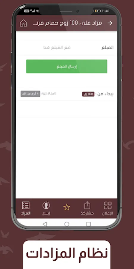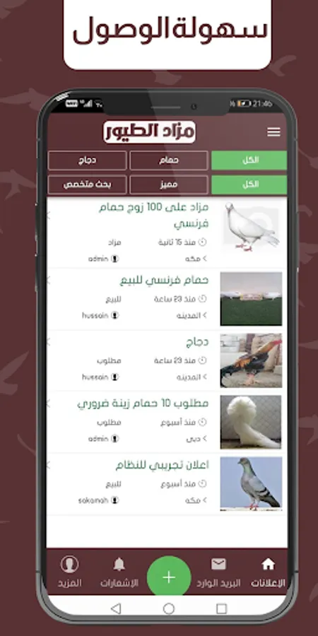 Auction and offers for all types of broiler, sulfur, French, homing and ornamental pigeons, and for all types of Brahma, Fayoumi, Baladi, Chamo, Sprite, Turkish, French, Pakistani, and for all kinds of birds, hawks, wild birds, and for all other types of poultry, such as ducks, geese, and ostriches.