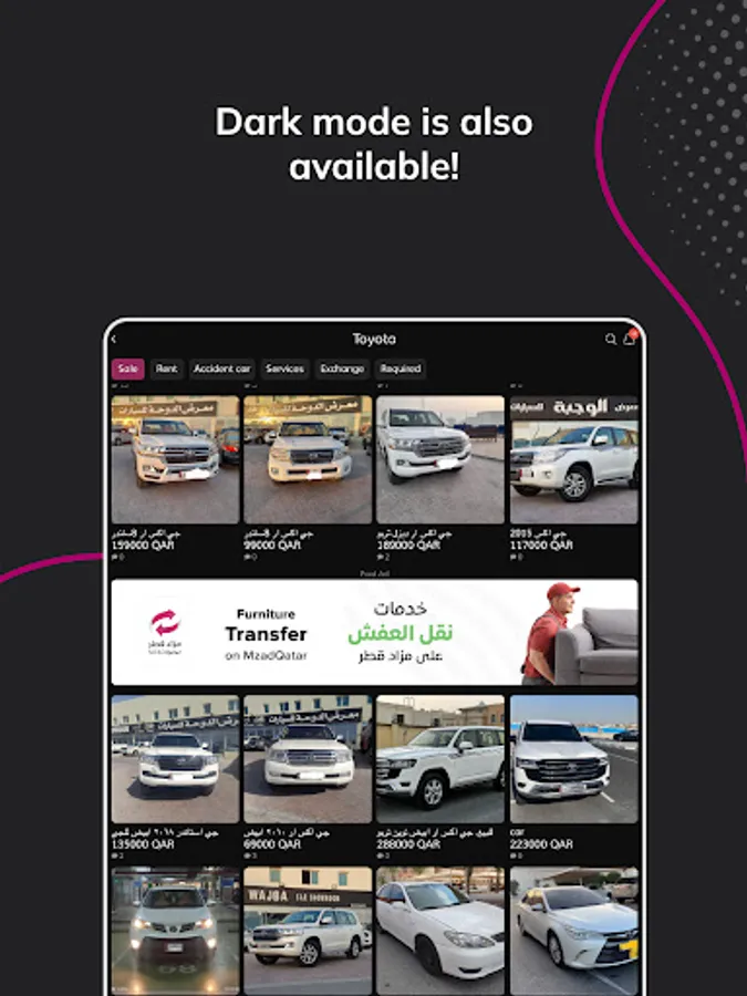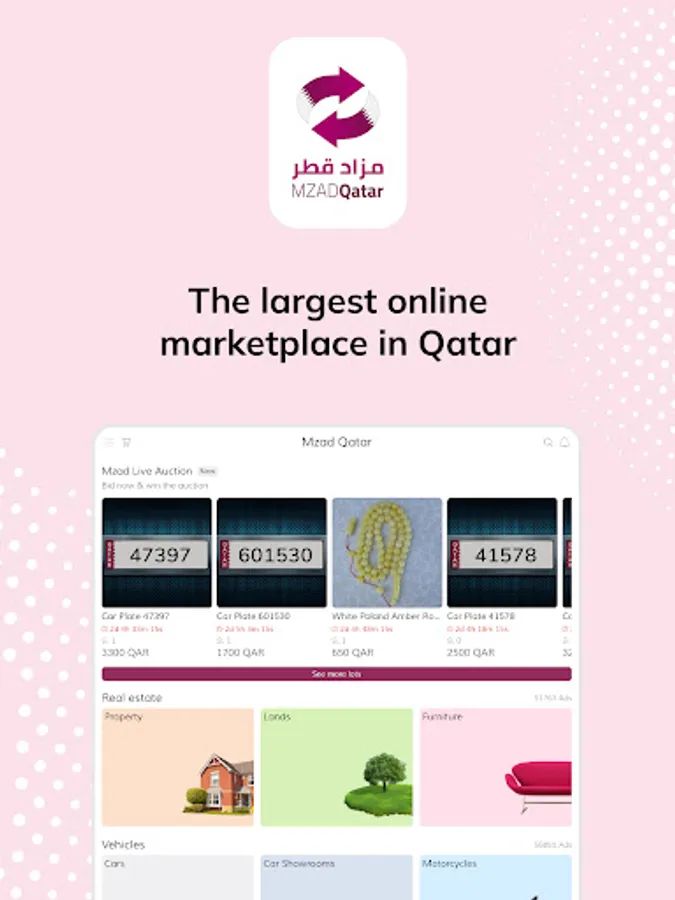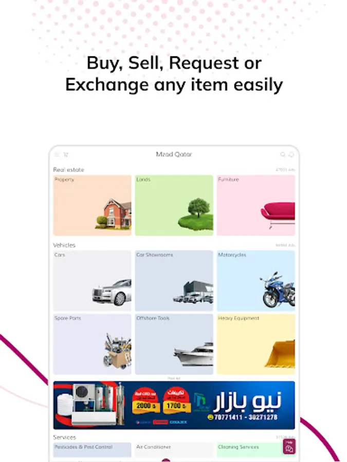 By downloading MzadQatar APP you get the largest platform to buy and sell in Qatar, Start immediately selling your products and what you don't need anymore, Or search what you need to buy easily in MzadQatar's various categories.