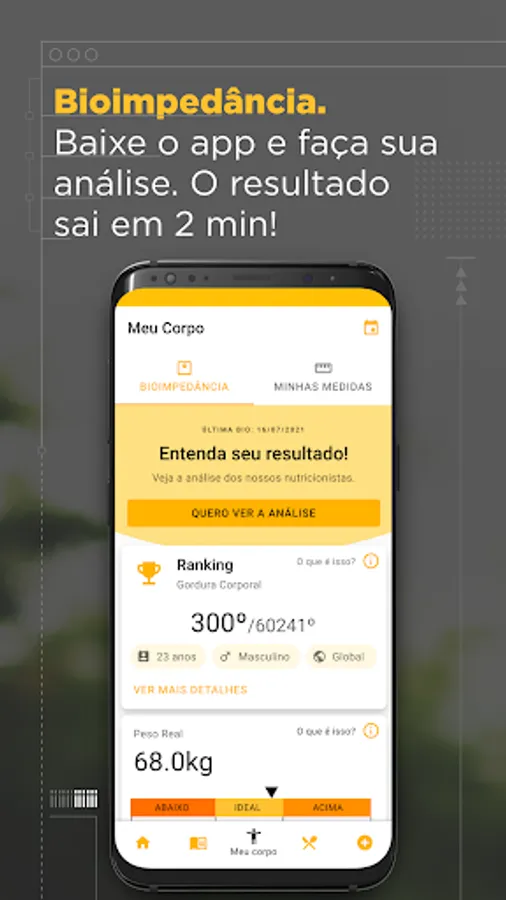 Start taking better care of your food with the help of online nutritionists and reach your goals without leaving home! Take the bioimpedance exam, record your measurements, follow evolution charts and access menu suggestions!