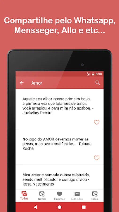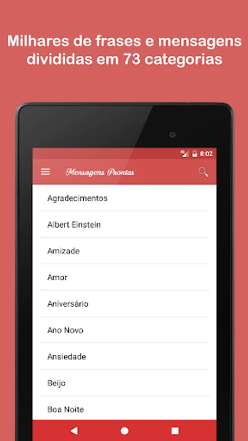 The application with more than 20,000 different phrases and messages to be used on WhatsApp and social networks. In it you will find phrases of love, friendship, biblical, birthday, good morning, good afternoon, good night, indirect, funny, good week, motivation, reflection, thanks, commemorative dates, ready to share and put in your status.