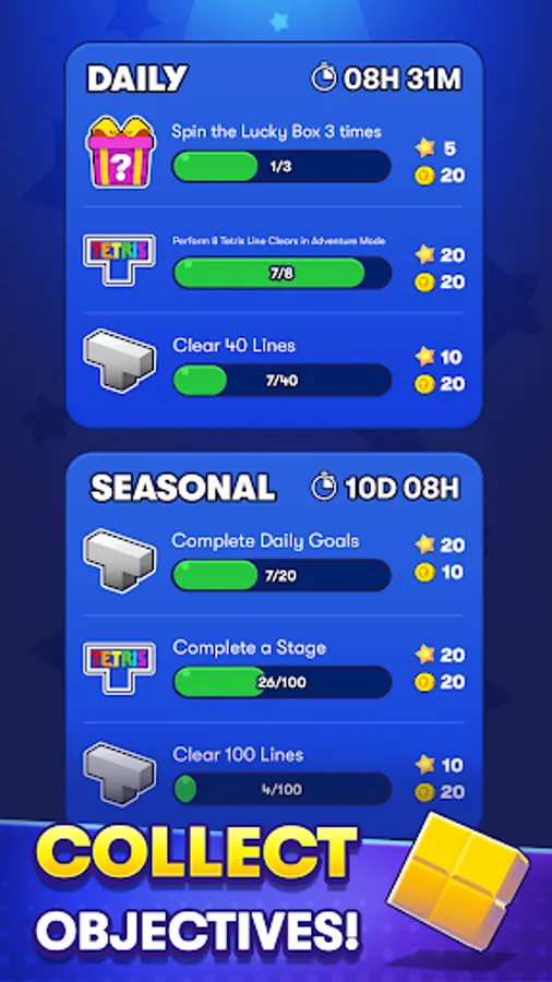 • Puzzle your way through challenging but fun objectives by playing Tetris.