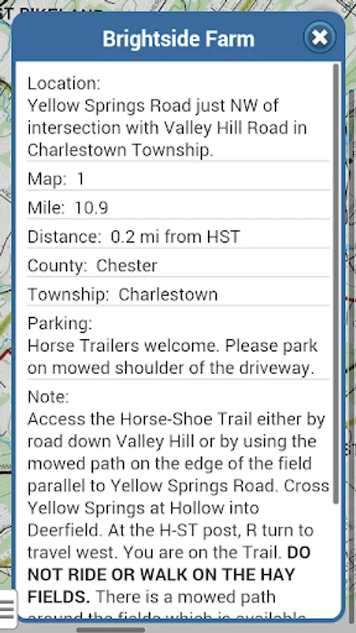 This app is only for select beta-test members of the non-profit Horse-Shoe Trail Conservancy, the volunteer organization that maintains and preserves this historic trail for public use.
