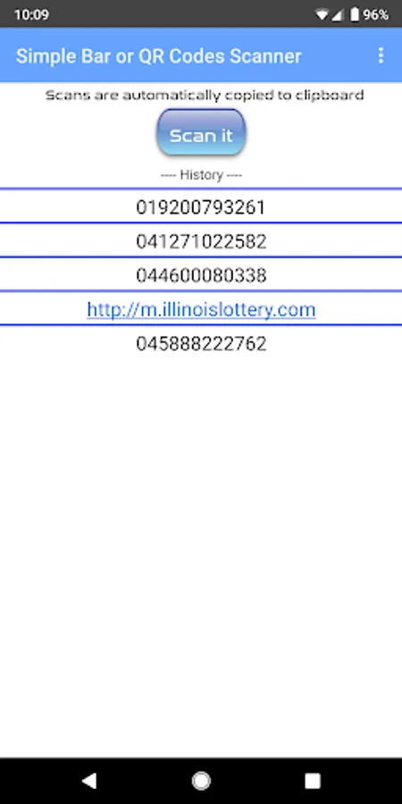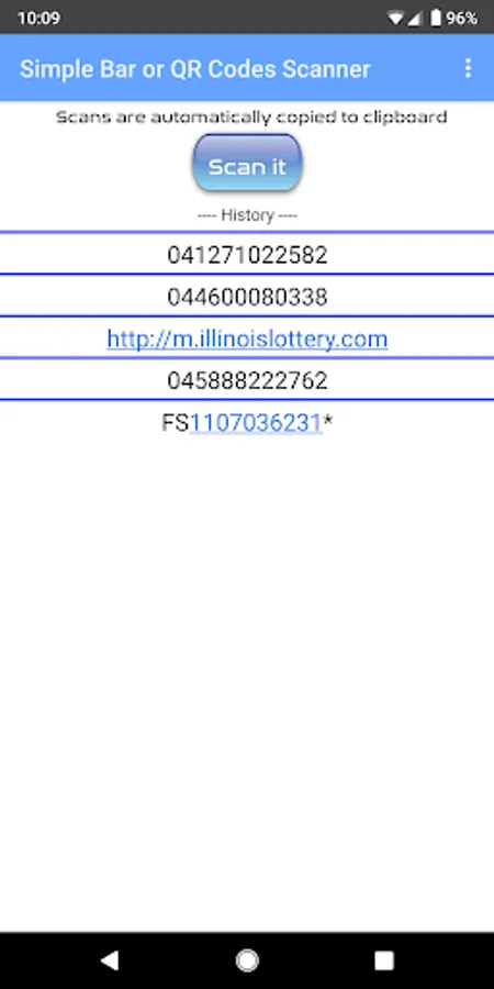 One screen does it all. Hit the "scan it" button, scan your qr code or barcode. It copies that scan to the clipboard and displays the last five scans.