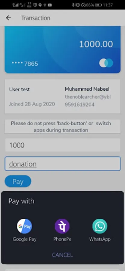 The user can login select the organization and pay the desired amount through the pre installed UPI payment Apps.