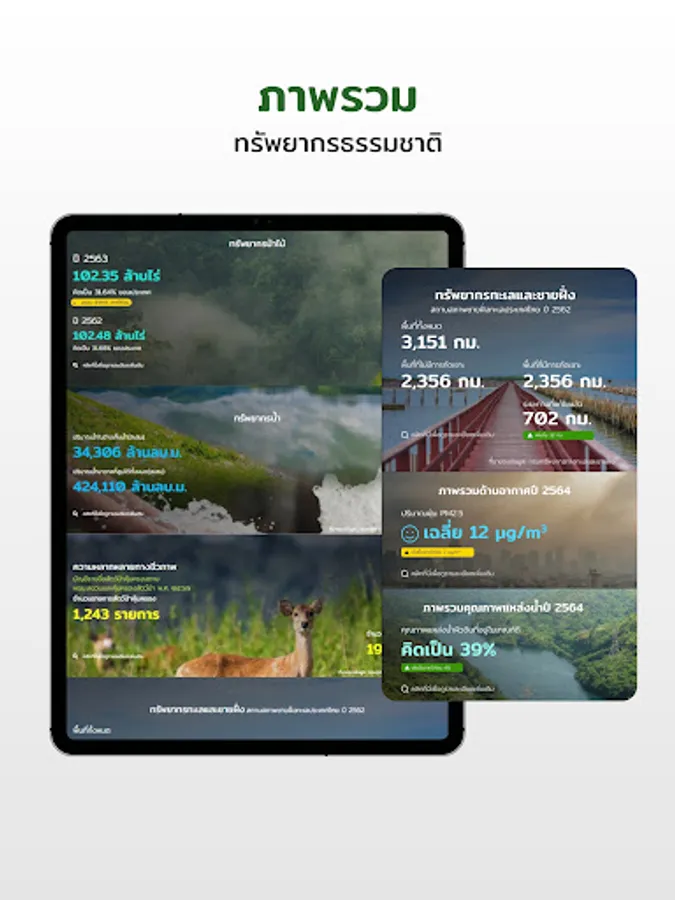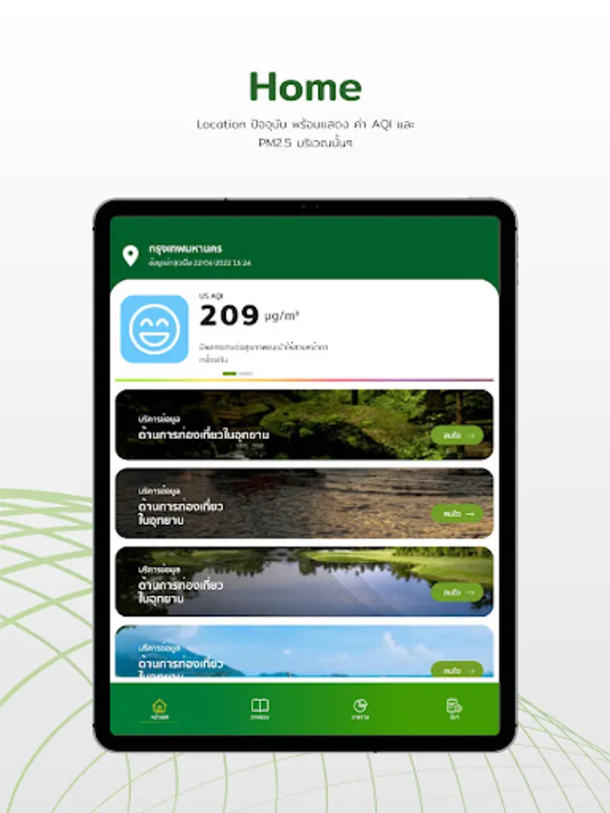 Our application is used to service the useful information for our users. The data displaying on this app depends on user's location, air quality report, annual report overview of natural resources and environment in five areas, as well as important and interesting reports to serve as a source of information. Also notifies about the situation of natural resources and the environment in order to plan their activities.