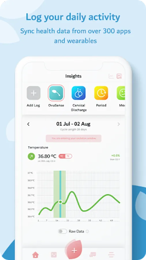 LOG YOUR DATA • Track vital health signals to provide a view of your monthly menstrual cycle and ovulation calendar. You can add this manually or you can connect OvuSense, the vaginal thermometer to track your basal body temperature for accurate ovulation prediction.