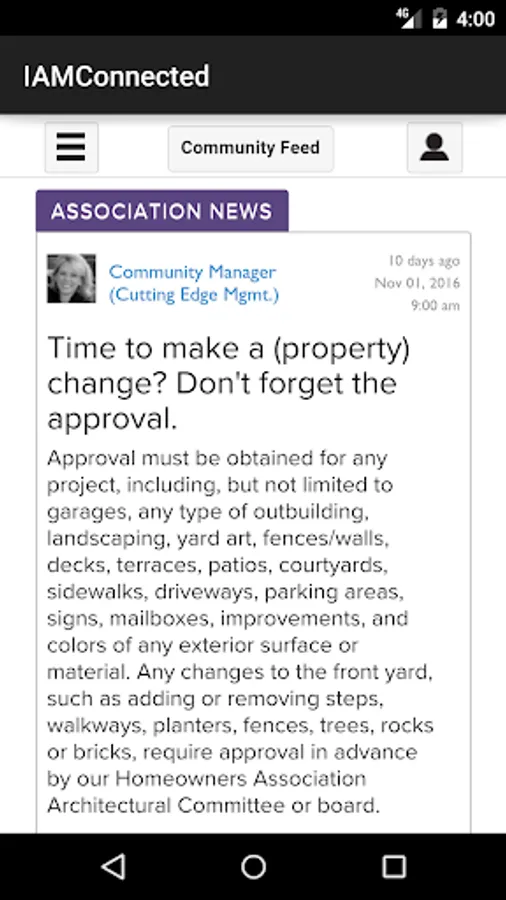 IAMConnected is a robust communication tool for your neighborhood and is exclusively provided to your community by Insight Association Management, your association’s management company. IAMConnected can deliver important news, reminders and other information via email, text, web and the IAMConnected mobile app so you are always in the know.