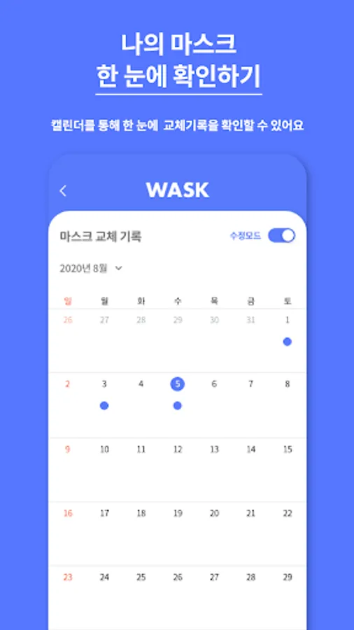 Check how many days you've been using your mask right from the status bar or from in-app calendar. With WASK, you can check how many masks you change each month and decide whether you need to get a new one.