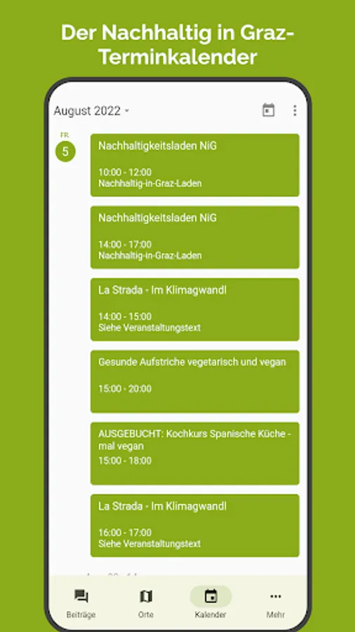 One of the most popular sources of information on the NiG website - the calendar with all sustainable dates - must of course not be missing in the app. A clear list with links to the details is available in the menu item Calendar.