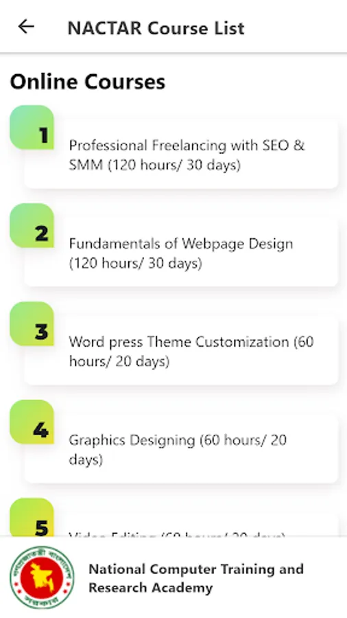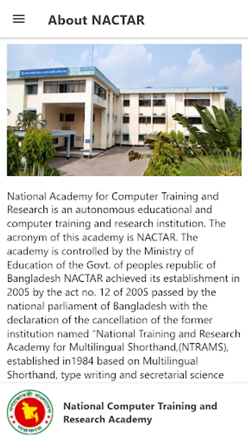 National Academy for Computer Training and Research is an autonomous educational and computer training and research institution. The acronym of this academy is NACTAR. The academy is controlled by the Ministry of Education of the Govt. of peoples republic of Bangladesh NACTAR achieved its establishment in 2005 by the act no. 12 of 2005 passed by the national parliament of Bangladesh with the declaration of the cancellation of the former institution named “National Training and Research Academy for Multilingual Shorthand,(NTRAMS), established in1984 based on Multilingual Shorthand, type writing and secretarial science training.