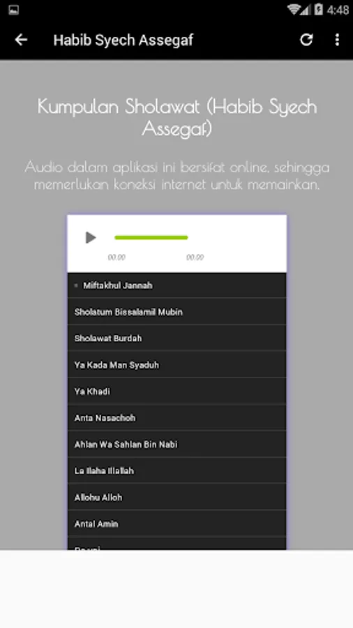 The audio in this app is an online streaming segue, so it requires an internet connection to play.