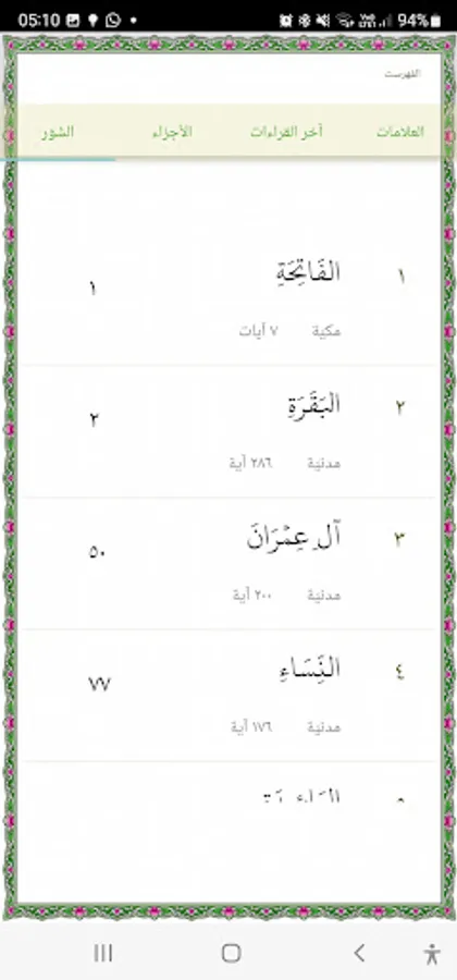 Using it to read a surah from the Quran, the application will save a mark for the last page of the surah you read along with the date to follow up later.