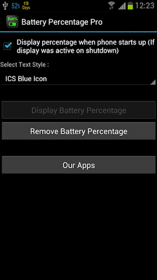 Battery Percentage shows how much battery power your phone has left in the Android status bar. The percentage fits in and appears as if its part of the Android OS unlike some battery icons.