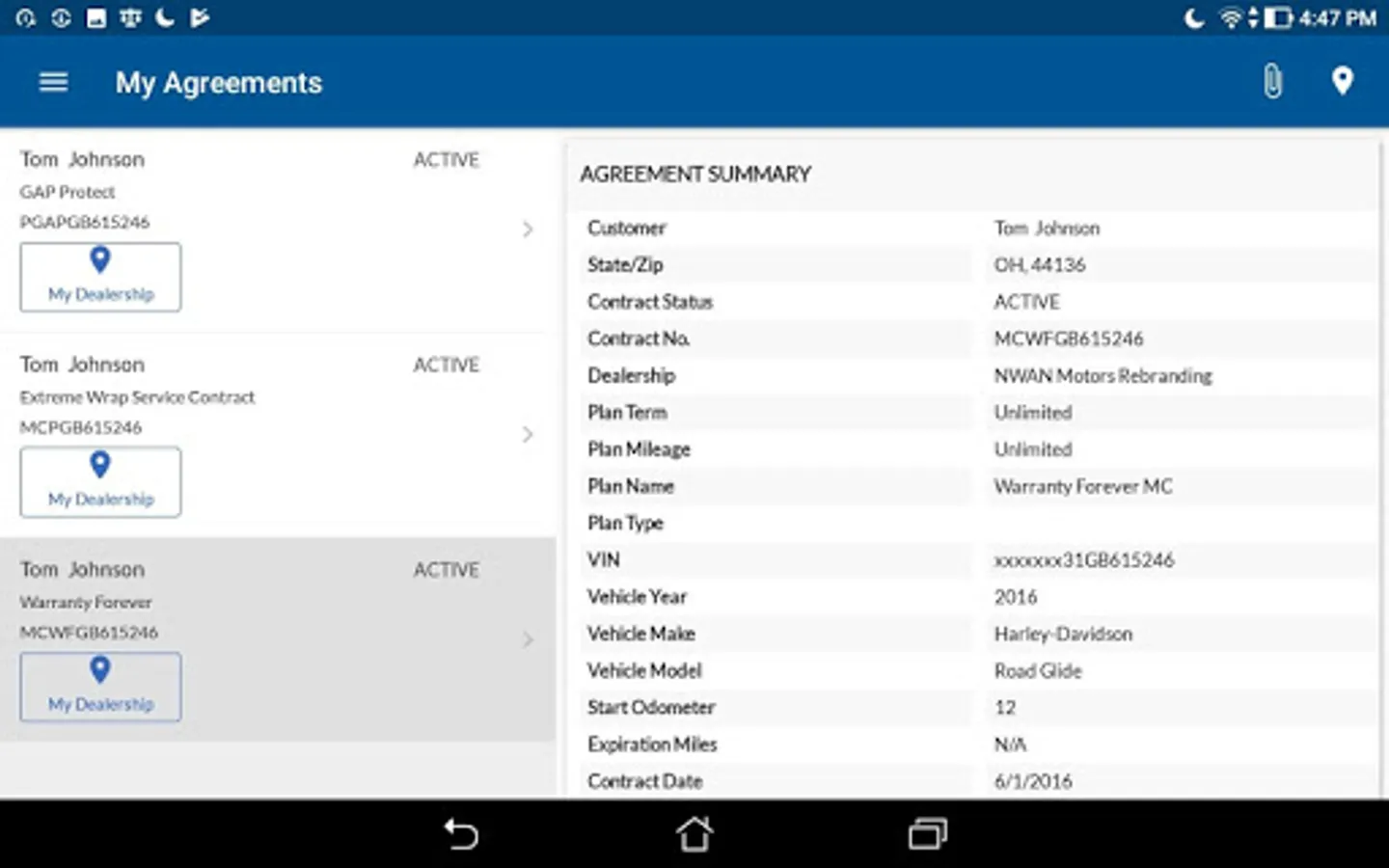 The mobile version of our Online Account Management System (OAMS) providing agents and dealers with access to the Dashboard, Claims Desktop and PPM Desktop. Customers can access their agreement information, upload maintenance records and more!