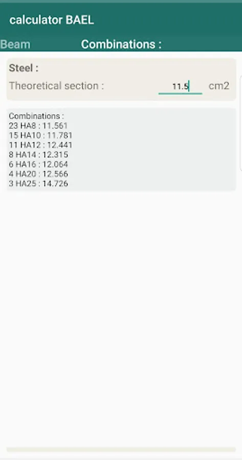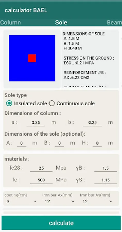 This application will allow you to design reinforced concrete elements according to the BAEL regulation (column, soles, beams) and also to propose you steel combinations for the reinforcement of the elements.