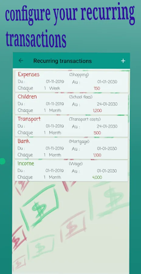• Define your recurring transactions by number of days, weeks, months or years ;