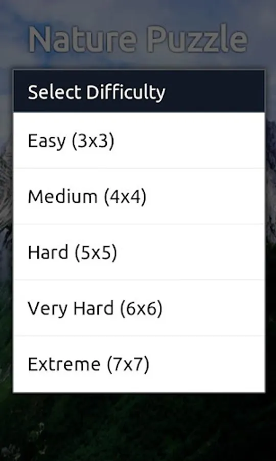There are 20 puzzles and 5 difficulties. get ready to relax and have fun with wonderful mountain pictures!