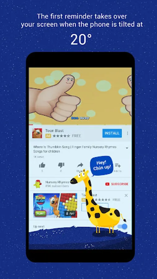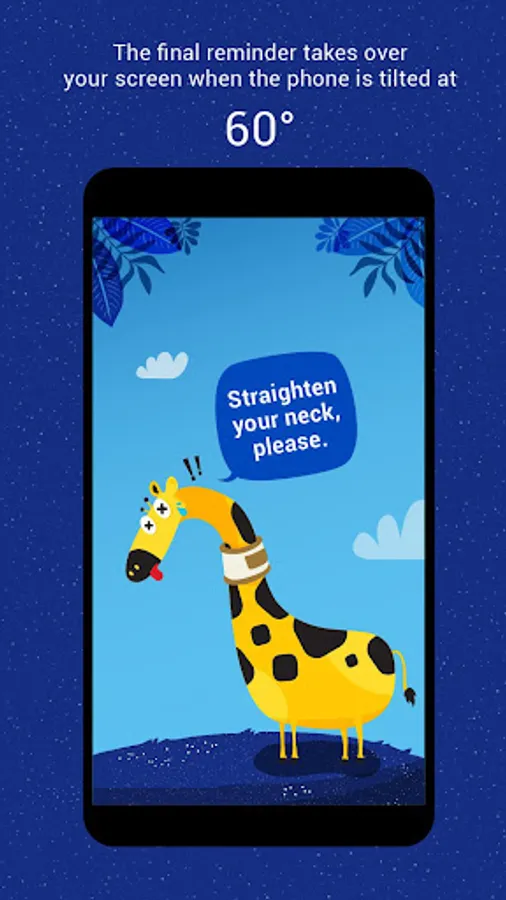 Once activated, the app runs in the background. When the phone is tilted at a dangerous degree, a friendly reminder takes over the screen. The only way to resume activity is to hold the phone at a