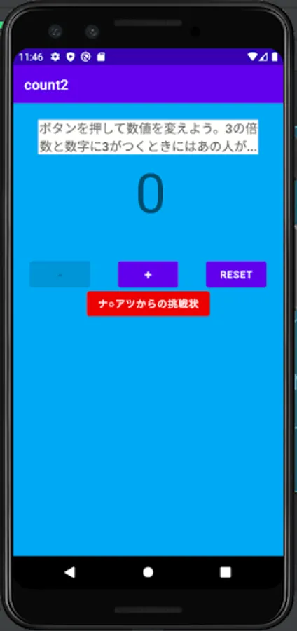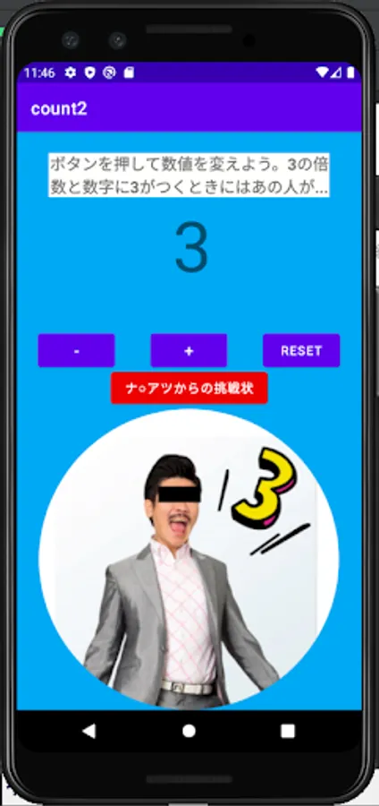 This application is a counting application, and the displayed number changes by pressing the plus button and minus button. But it's not just a counting app! As the title says, it's stupid only when it's a multiple of 3 and a number with 3.