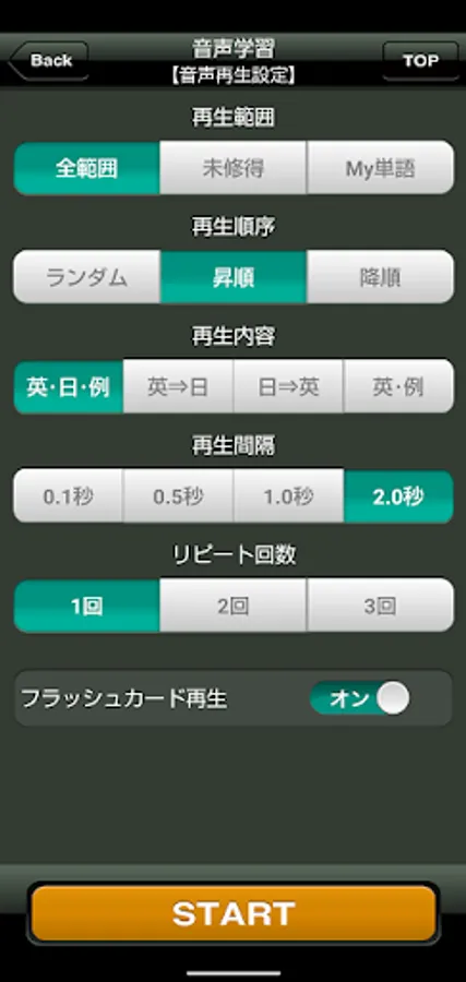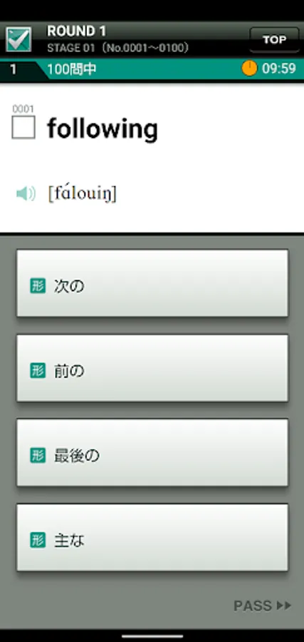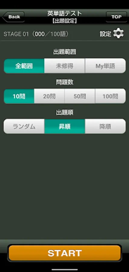If you want to learn STAGE quickly, set the number of questions to 100 and test twice in a row. By asking 100 questions x 2 times, the word "unacquired" will be highlighted. After that, narrow down the question range to "Unacquired" and test. If you answer correctly twice in a row, "not acquired" becomes "acquired".