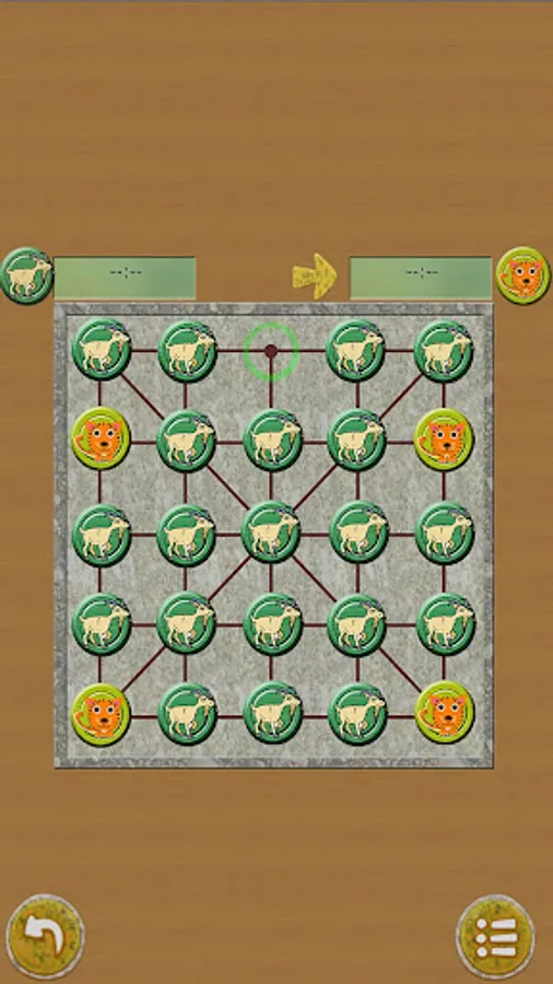 The game has two phases. In the first phase, the Tigers are put at corner of the board. Players take turns to plays and goats start first.Only tigers can move at the first phase. Once all goats have been placed to the board, the second phase started in which the goats can move too.