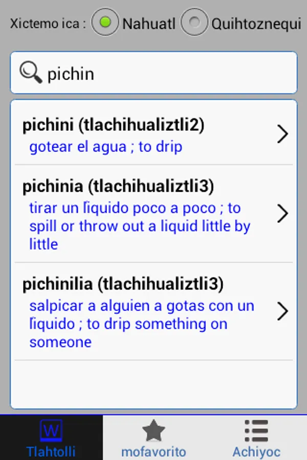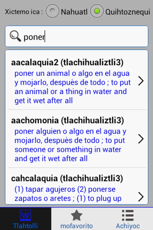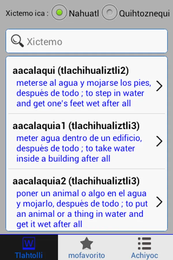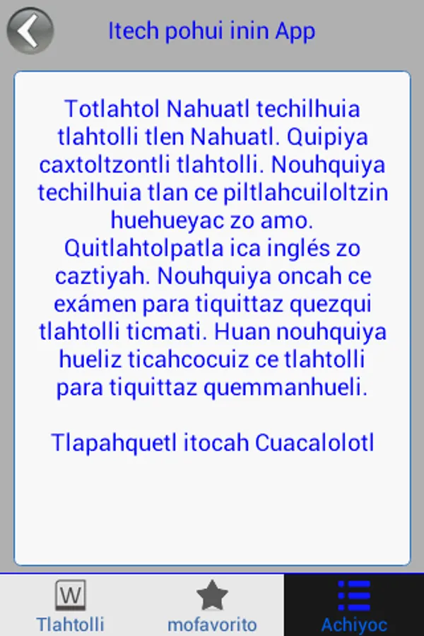Nahuatl Language dictionary based on the Huasteca variety in Chicontepec, Veracruz. Words were collected thanks to the Zacatecas Institute for Teaching and Research in Ethnology (IDIEZ). This dictionary several thousand words and is unlike any other APP published so far in Nahuatl/Nawatl/Nauatl. For more, visit Macehualli.org.