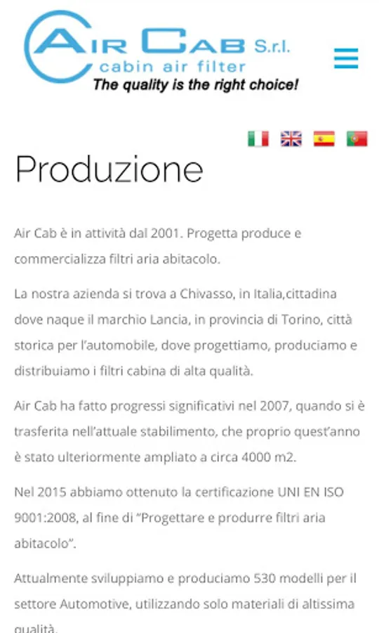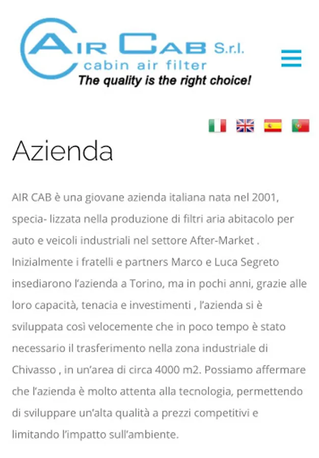 AIR CAB is a young Italian company founded in 2001, specialized in the production of cabin air filters for cars and industrial vehicles in the After-Market sector. Initially the brothers and partners Marco and Luca Segreto settled the company in Turin, but in a few years, thanks to their skills, tenacity and investments, the company has developed so quickly that in a short time it was necessary to move to the industrial area of Chivasso, in an area of about 4000 m2. We can affirm that the company is very attentive to technology, allowing it to develop high quality at competitive prices and limiting the impact on the environment.