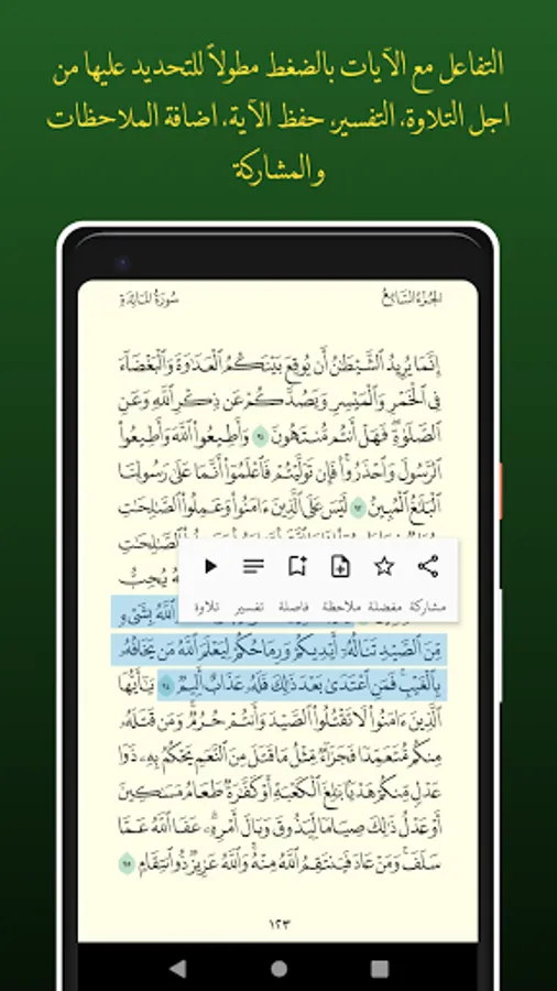 4. Interact with verses by pressing long to select them for recitation, interpretation, memorizing the verse, adding notes and sharing.
