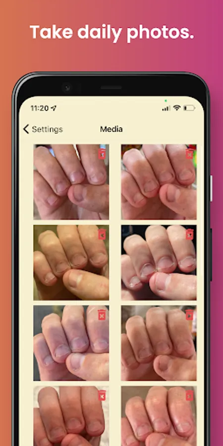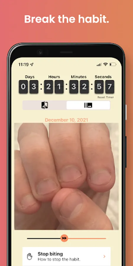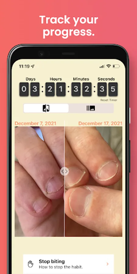 I've suffered from this bad habit for a long time. I tried many different things, but nothing helped me more than seeing my nails in photos. NailKeeper will keep track of your nails growth by showing you a photo comparison and video progression of your nails. Easily track your progress and quit nail picking and biting habit.