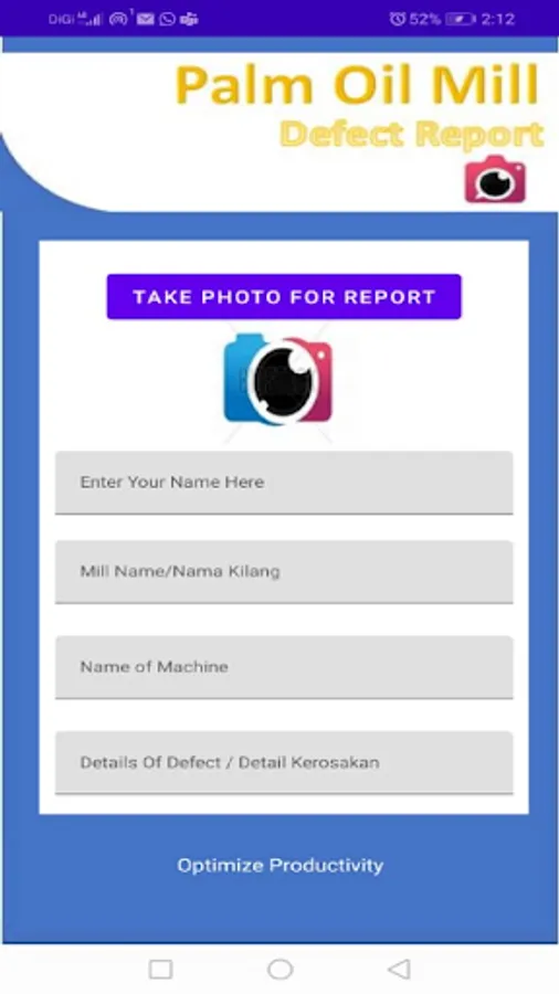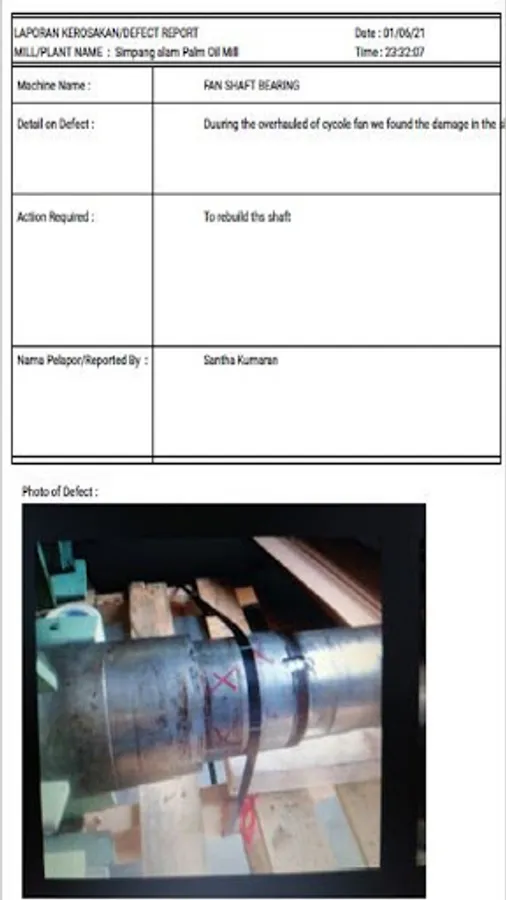 The Palm Oil Mill field reporting solution for online and offline data capture. By replacing pen and paper forms, the mobile Defect Report app takes its users through a user friendly and intuitive process to seamlessly execute field inspection and maintenance tasks.You can share the report efficiently to whatsapp google drive email and pc easily.
