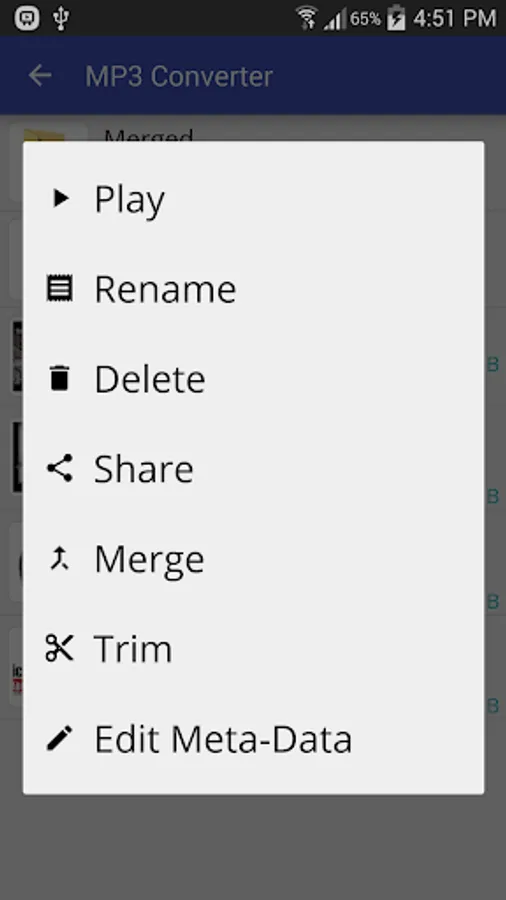 - Options (Play, Delete, Rename, Share, Edit Meta-Data, Trim, Merge)
