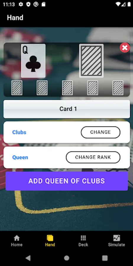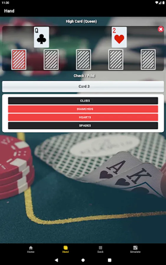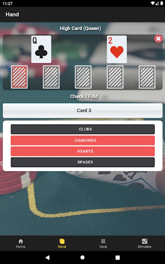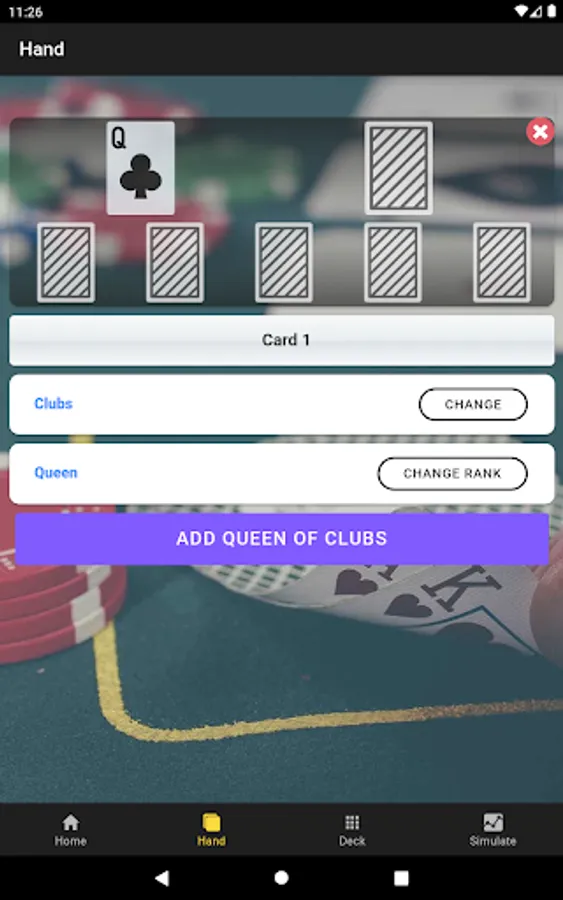 It will then run your hand through thousands of simulated games and display your odds of winning. The more cards you select in the simulation, the more accurate it will become.
