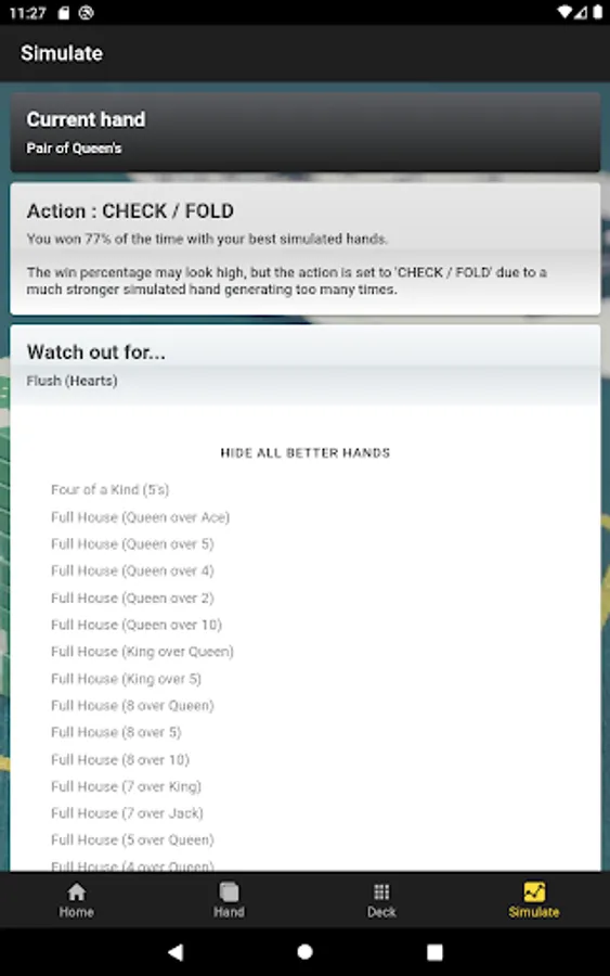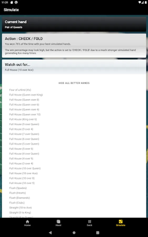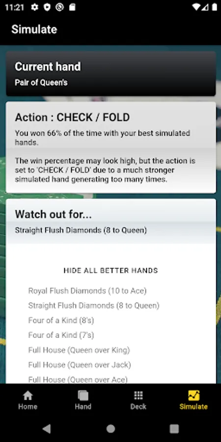 Simulated hands that were stronger than yours will be available to review, so you have a greater chance of assessing what to watch out for in your real game!